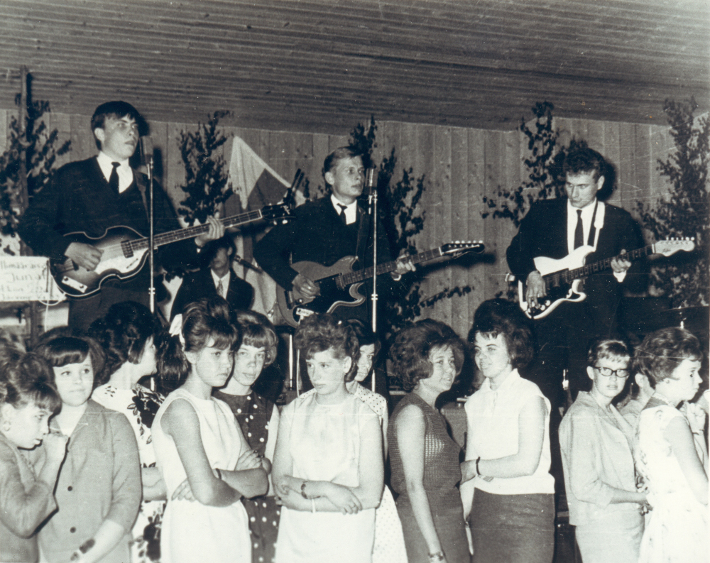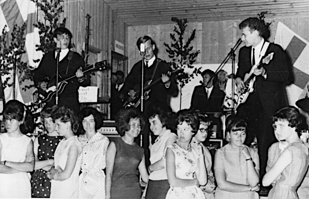 Lasse, Hasse, Kajde ja Curre. Takana Suomen lippu ja juhannuskoivut ja edessä tyttömuuri juhannuksena 1964. Bändi ei selvästikään soita tangoa, eivätkä tytöt pääse tanssimaan.